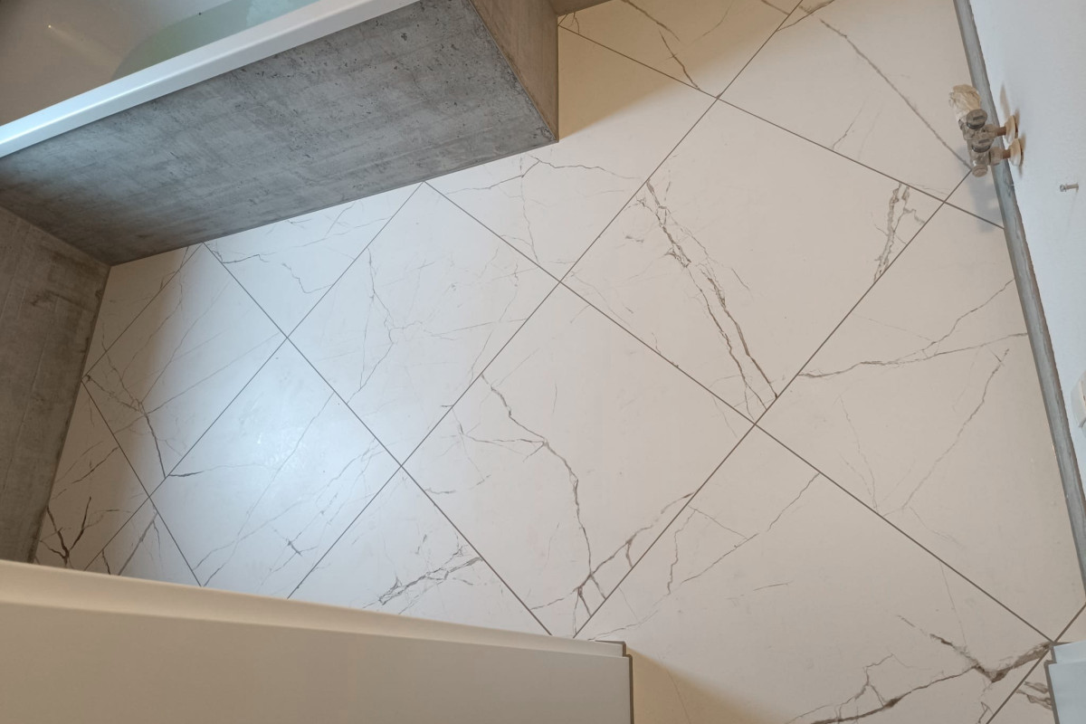 ✔ Boden: 60x60 cm Marmoroptik, diagonal verlegt für eine besondere Raumwirkung